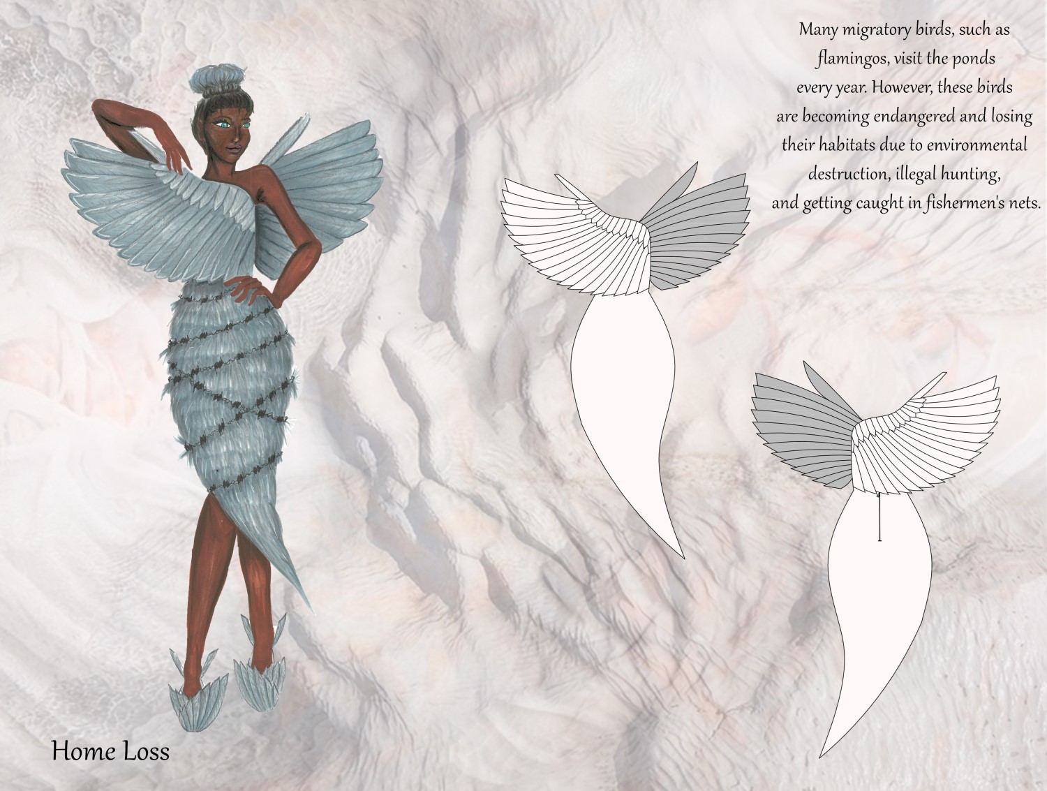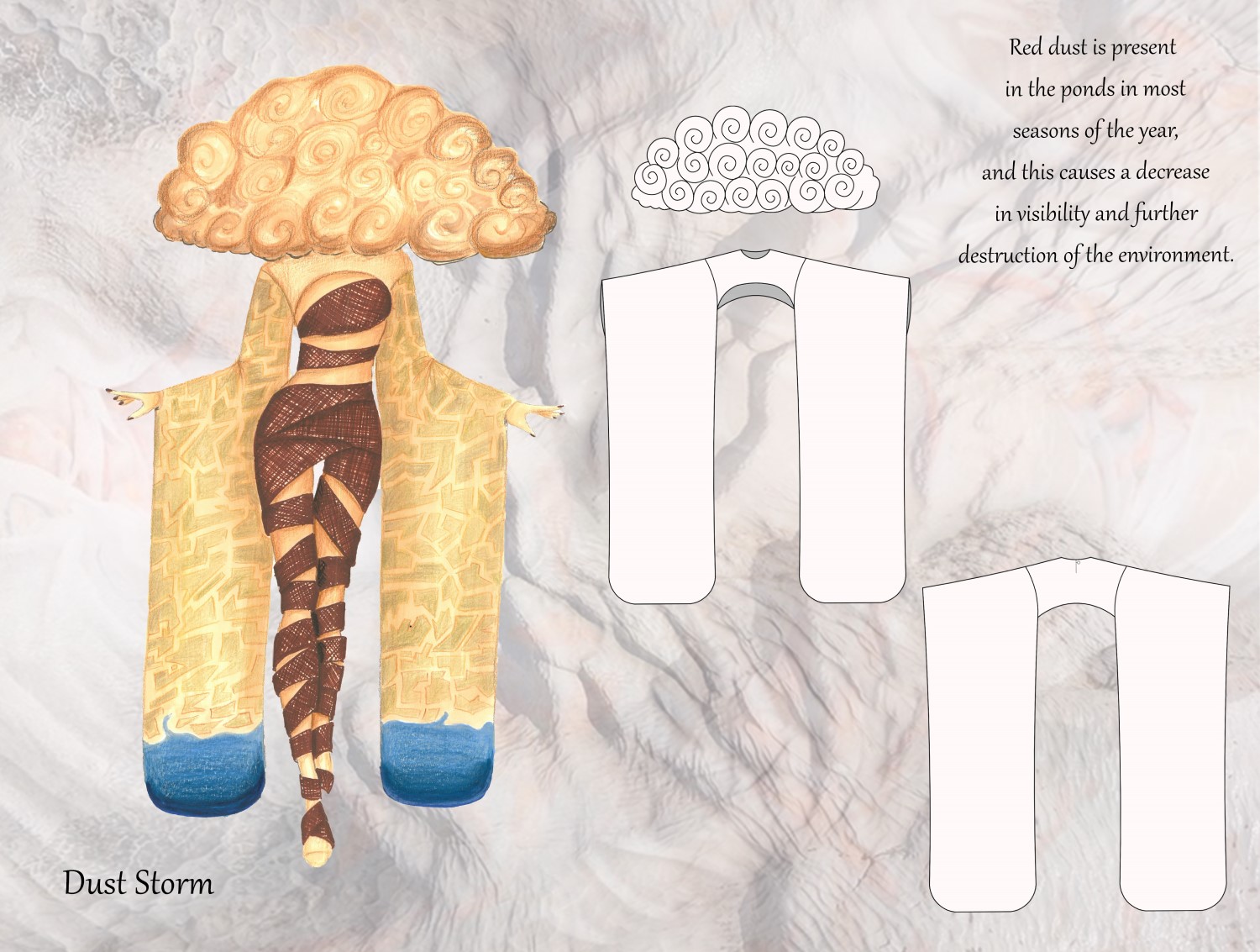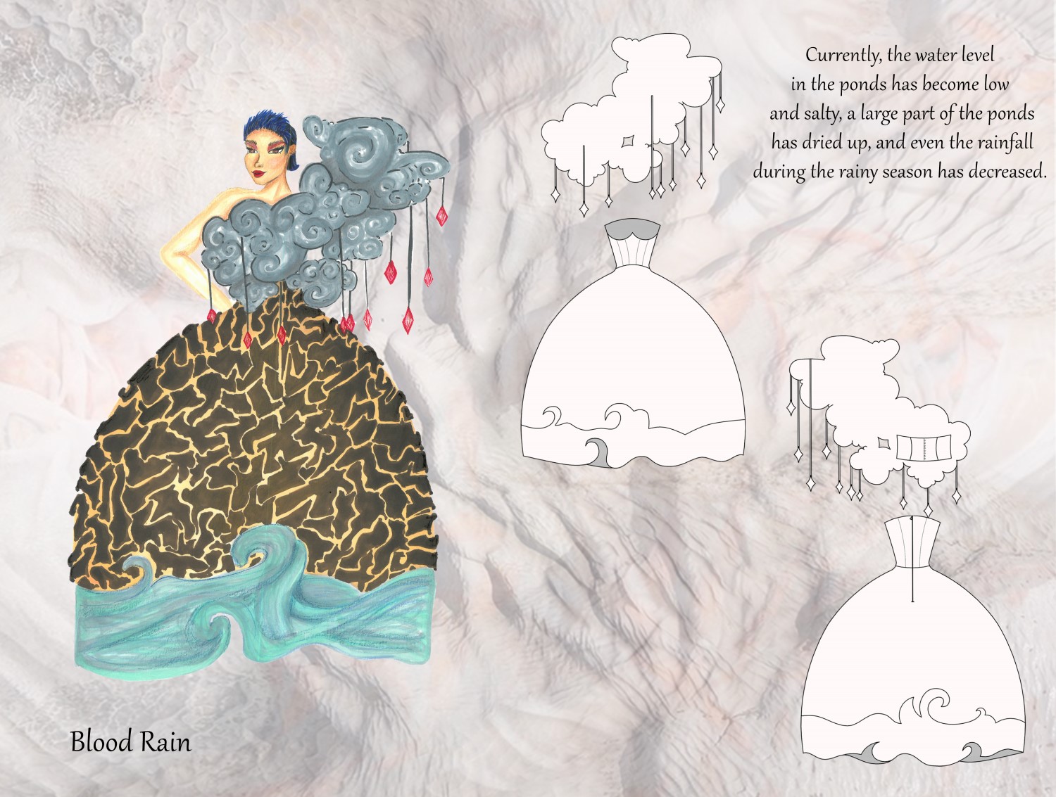 For this collection, I used avant-garde work style. It was the best style to freely depict pain and suffering. Captive birds, the thirst of the earth, the loss of vegetation and the red rain that shows the peak of pain and dehydration. This collection shows a small part of the earth’s environmental problems. So, an effort was made to produce this collection with minimal damage to the earth